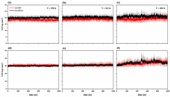 Time evolution of solvent accessible surface area for the BstHPr (red line) and BstHPrm (black line) proteins at (a) 298 K, (b) 362 K, and (c) 400 K for SASAp and (d) 298 K, (e) 362 K, and (f) 400 K for SASAnp. The solid lines and shaded areas represent the average values and their standard deviation from the three replicas of MD simulations, respectively. Details on these trajectories and the average values for the temperatures analyzed are given in Figures S14 and S15 of the Supplementary Materials.