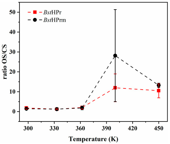 Ratio of OS/CS for BstHPr and BstHPrm proteins at different temperatures of simulation. Symbols represent the avg values, and the SD values are indicated with bars. The dashed lines are only guides for the eye.