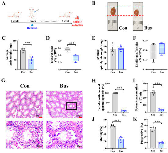 Healthy 4-week-old male ICR mice were procured from the animal center of the Fourth Military Medical University. They were then placed in a controlled environment (temperature ranging between 22 °C and 24 °C, a 12 h light/12 h dark cycle, and free access to food and water). Following a one-week adaptation period, the five-week-old mice were randomly assigned to two treatment groups (n = 6 mice for each group): the control group (Con) and the busulfan group (Bus). Mice in the Bus group were administered a single intraperitoneal injection of busulfan (40 mg/kg body weight) diluted in dimethyl sulfoxide (DMSO), while the Con-group mice were injected with normal DMSO. At 10 weeks old (5 weeks after injection), the mice were sacrificed. Testes, epididymides, and organ weight were recorded from the mice of all groups. The epididymides of the mice were used for the determination of sperm parameters, and the testes from the mice were fixed in 4% paraformaldehyde or stored at −80 °C for further analysis.