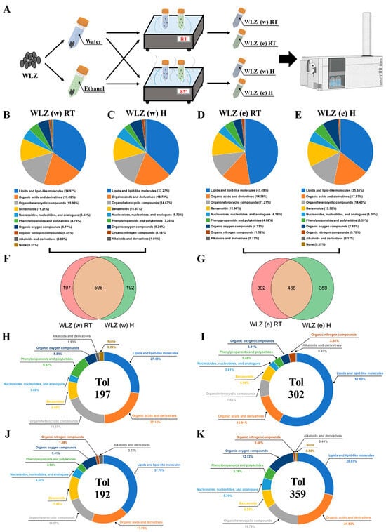 The composition changes in different WLZ extracts. (A) The untargeted metabolome profiles generated on different WLZ extract samples using an LC-MS (Liquid Chromatograph–Mass Spectrometer). WLZ (w) RT, the WLZ water extract at room temperature; WLZ (e) RT, the WLZ ethanol extract at room temperature; WLZ (w) H, the WLZ water extract at 85 °C; WLZ (e) H, the WLZ ethanol extract at 85 °C. (B–E) The components found in different WLZ extracts. (F,G) The Venn diagrams generated to describe the common and unique metabolites in the WLZ water extract (F) and WLZ ethanol extract (G) at different temperatures. (H–K) The components of the unique metabolites in WLZ (w) RT (H), WLZ (e) RT (I), WLZ (w) H (J), and WLZ (e) H (K). n = 3 for each group.