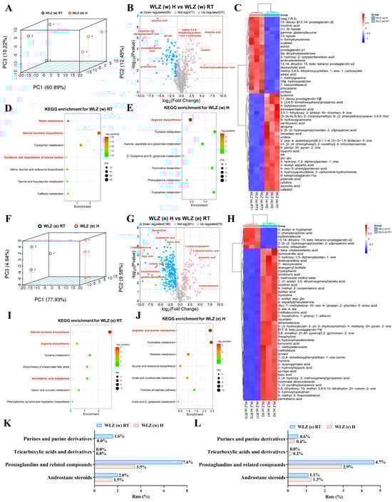 The metabolome changes in the WLZ water extract and WLZ ethanol extract at different temperatures. (A–E) The metabolomic changes in WLZ (w) RT and WLZ (w) H; (A) the 3D principal component analysis (PCA) score plot; (B) volcano plot showing the changes in metabolites; (C) heatmap of the top 50 differential metabolites; (D,E) the KEGG enrichment analysis of differential metabolites in WLZ (w) RT and WLZ (w) H. (F–J) The metabolomics changes in WLZ (e) RT and WLZ (e) H; (F) the 3D principal component analysis (PCA) score plot; (G) volcano plot showing the changes in metabolites; (H) heatmap of the top 50 differential metabolites; (I,J) the KEGG enrichment analysis of differential metabolites in WLZ (e) RT and WLZ (e) H. (K,L) The bar plot based on the differential metabolites which were enriched in the reproduction-related classes. n = 3 for each group.