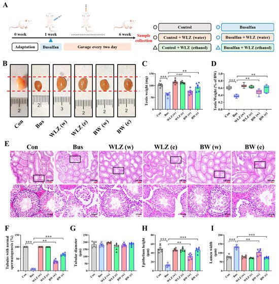 After finding that WLZ room-temperature extracts had a positive potential function in male reproduction, our focus shifted towards investigating the potential of WLZ in alleviating testicular injury in vivo. The model shown in Figure 1 was used. Different WLZ extracts (Figure 4) were administered by gavage every two days after injection with busulfan or DMSO (Figure 5A). The results showed significant alleviation of testicular injury after WLZ water and ethanol extract treatment [BW (w) and BW (e)], including in testis weight (p = 0.07, p < 0.01) and testis index (both p < 0.01) (Figure 5B–D). However, the treatment did not influence the epididymis weight, epididymis index, or organ index of mice (Figure S3A–C). H&E staining was performed to further characterize the testis phenotype (Figure 5E). The results suggested that both the water and ethanol extracts could significantly recover the busulfan-decreased percentage of normal spermatogenesis tubules (p < 0.01, p < 0.001) (Figure 5F). However, the busulfan or WLZ treatment did not change the testis tubular diameter (Figure 5G). Still, busulfan significantly reduced the epithelium height (p < 0.001) and increased the lumen width of the testis (p < 0.001). In contrast, the WLZ treatment could recover these (Figure 5G–I). These results suggested that both WLZ water and ethanol extracts could significantly alleviate the busulfan-impaired testis function.