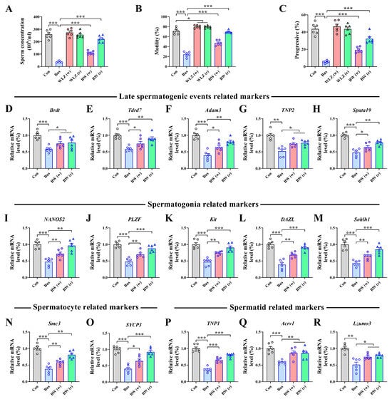 Moreover, to further investigate changes in sperm quality and spermatogenesis signaling in the testes, we examined their sperm parameters and the expression of spermatogenesis-related markers. Specifically, we observed a decreased concentration (p < 0.001), motility (p < 0.001), and progressive motility (p < 0.001) of sperm in the busulfan treatment, which could all be reversed by WLZ treatment (all p < 0.05) (Figure 6A–C). The sperm parameter data also confirmed the above-mentioned observed results (Figure S3D–K). Since the WLZ treatment appeared to have no effect on the testes and sperm in the Con group [WLZ (w) and WLZ (e)], the additional study mainly focused on the BW (w) and BW (e) groups. For the spermatogenesis process, we measured the mRNA expression of a series of spermatogenesis-related genes. We observed that the expression of the mRNAs involved in late spermatogenic events was significantly decreased after busulfan treatment, including Brdt (p < 0.001) (bromodomain testis-specific factor), Tdrd7 (p < 0.001) (Tudor domain-containing 7), Adam3 (p < 0.001) (metallopeptidase domain 3), TNP2 (p < 0.01) (transition protein 2), and Spata19 (p < 0.001) (spermatogenesis-associated 19). However, the WLZ extract treatment improved these reduced genes (all p < 0.05) (Figure 6D–H). Similarly, we also observed that the WLZ extracts also recovered the mRNA expression of the markers of spermatogonia (marked by NANOS2, PLZF, Kit, DAZL, and Sohlh1), spermatocytes (marked by Smc3 and SYCP3), and spermatids (marked by TNP1, Acrv1, and Lzumo3), which reduced after busulfan treatment (all p < 0.05) (Figure 6I–R). These results indicate that WLZ extracts safeguard spermatogenesis by enhancing the progression from spermatogonia to spermatocytes and ultimately to spermatids.