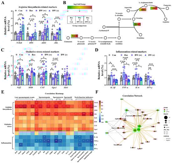 WLZ regulated arginine biosynthesis to affect the oxidative stress and inflammation in the testes. (A) Real-time PCR analysis of the mRNA expression of arginine biosynthesis-related markers. (B) Gene expression in arginine biosynthesis pathway. Green represents down-regulated genes, while red represents up-regulated genes in the Bus group. (C,D) Real-time PCR analysis of the mRNA expression of oxidative stress-related markers (C) and inflammation-related markers (D). (E) Sperman’s correlation between testis-related indicators and arginine-related indicators. (F) The correlation network of significant markers in (E). n = 6 for each group. All data are presented as means ± SEM. Statistical analysis was conducted using one-way ANOVA followed by Sidak’s multiple comparisons test. * p < 0.05, ** p < 0.01, *** p < 0.001.