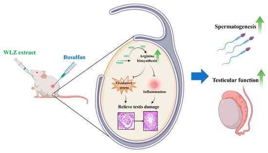 In the previous results, we found that both the water and ethanol WLZ extracts can alleviate impaired testis function. Moreover, the pathway and KEGG enrichment showed that the arginine biosynthesis pathway was significantly enriched in the metabolites of both WLZ extracts. Thus, we further measured the expression of the key genes involved in arginine biosynthesis (map00220) (Figure 7A,B). The mRNA expression showed that busulfan reduced the mRNA expression of nearly all arginine biosynthesis-related genes, including NAGS (p < 0.01), OTC (p < 0.05), ASS1 (p = 0.09), and ASL (p < 0.01). The WLZ extracts could re-increase the expression of arginine biosynthesis-related genes. As a functional amino acid, recent studies revealed that arginine plays an important role in regulating oxidative stress and inflammation [,,]. Coincidentally, the spermatogenic cells were highly susceptible to oxidative insult, leading to a deleterious effect on spermatozoa [,], and the inflammation in the testis was also closely associated with germ cell aplasia [,]. Our findings showed that the restarted arginine biosynthesis in the testes displayed a strong correlation with the recovered spermatogenesis in the WLZ treatment. Thus, we further strove to clear up the possibility that WLZ extracts re-up-regulated arginine biosynthesis in the testes to alleviate the busulfan-induced testis function, which may be associated with oxidative stress and inflammation in the testis. To clarify this hypothesis, we determined the expression changes in the markers involved in oxidative stress and inflammation in the testes. As shown in Figure 7C,D, busulfan significantly down-regulated the mRNA levels of the oxidative stress-related genes Nrf2, SOD, and Gpx1 (p < 0.05) and had a decreasing trend in CAT (p = 0.08). Both WLZ extracts had a significant or trending re-increase in the expression of these genes. Oppositely, busulfan up-regulated the mRNA expression of inflammation-related genes. At the same time, WLZ extracts reversed these phenomena. At last, we performed Spearman’s correlation analysis on the spermatogenesis process indicators and the expression of arginine signaling (Figure 7E). The correlation network based on these is shown in Figure 7F. The arginine biosynthesis key genes NAGS, OTC, and ASL were most positively correlated with the spermatogenesis process indicators, such as sperm motility; spermatogenesis tubules; and epithelium height, and the gene marker expressions of late spermatogenic events, spermatogonia, spermatocytes, and spermatids. Moreover, the anti-oxidative factor Gpx1 was positively correlated with most indicators of spermatogonia, spermatocytes, and testis function, while the inflammatory factors IL-1β, TNF-α, and IL-6 were negatively correlated with them. Collectively, these data further indicated that arginine biosynthesis may be involved in the recovery of WLZ-induced testicular injury, which may be mediated by the regulation of oxidative stress and inflammation in the testes, thus assisting in the recovery of spermatogenesis and testicular function (Figure 8).