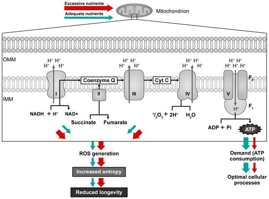 Mitochondrial efficiency with high nutrient supply/low ATP demand (red arrows) compared to adequate nutrient supply/adequate ATP demand (green arrows). Electrons escaping from the electron transport chain (ETC) generate ROS, and these molecules can damage the ETC components and mitochondrial DNA, leading to reduced ATP production and a further increase in intracellular ROS levels, resulting in further oxidative damage and a decline in mitochondrial function.