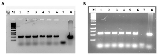 Integration of BnFAE1 (A) and LdLPAAT (B) in the transgenic lines, shown by clear bands, while no bands are visible in the wild type. M: 1 kb DNA ladder from GeneRuler, L1–L6: transgenic lines, L7: wild type, L8: plasmid DNA.