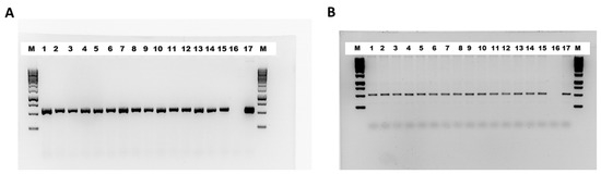PCR results of ScWS (A) and ScFAR (B) of the transgenic lines. M, 1 kb DNA ladder from GeneRuler; L1–L15, transgenic lines; L16, wild type; L17, plasmid DNA.