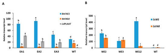The gene expression levels of BnFAE1, LdPLAAT and BcFAD2 in three erucic acid transgenic lines (EA1, EA2 and EA3) with reference to wild type (WT) (A), and the expression levels of ScWS and ScFAR in three wax ester transgenic lines (WE2, WE3 and WE12) in comparison with WT (B). Results are means of three biological replicates for each line and three technical replicates per biological replicate. Bars followed by different letters indicate significant differences at p = 0.05.