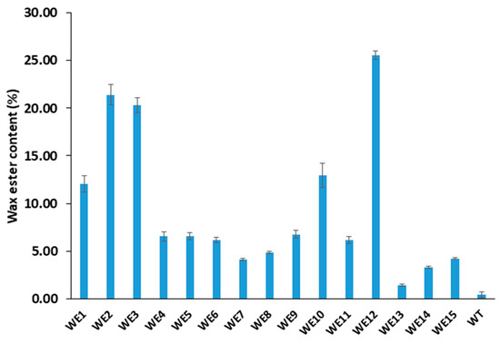 Wax ester contents of pooled seeds of 15 transgenic lines as determined by GC. Standard deviation and means of three biological replicates are shown (n = 3).