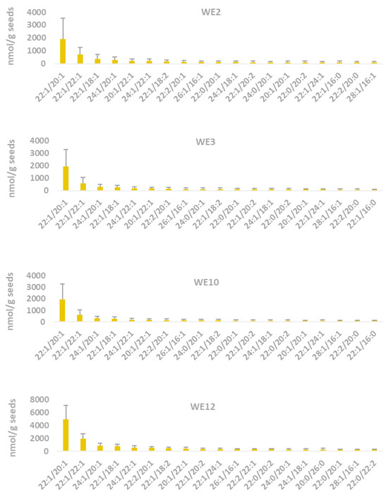 The total WE contents of 15 transgenic lines analyzed by nanoESI-MS/MS ranged from 307 to 21,744 nmol/g seed (Figure S1), showing a similar trend with the results of the top four highest amounts of WE that were obtained by GC.
