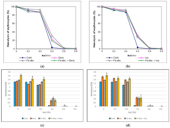 Percentage of osmotic fragility and statistical analysis of rat erythrocytes exposed to chronic administration of inhalation anesthetics—Sevoflurane (a,c), Isoflurane (b,d), iron dextran, and their combination. Rats (n = 10 per group) were treated with ip injection of iron dextran (50 mg/kg), exposed to 2.4 vol % Sevoflurane inhalation and 1.3 vol % Isoflurane inhalation, and exposed to a combination thereof where inhaled anesthetics were given 2 h after ip injection of iron dextran. Animals were treated every other day for 28 days. The results are expressed as the mean value of each experimental group ± SE. Statistically significant compared to the control group (* p < 0.05). ■ Statistically significant compared to the Sevoflurane group (■ p < 0.05). Abbreviations: ip, intraperitoneal; SE, standard error; Cont., control group; Sevo., Sevoflurane group; Iso., Isoflurane group; Fe-dex., iron dextran group; Fe-dex. + Sevo., group treated with iron dextran and Sevoflurane; Fe-dex. + Iso., group treated with iron dextran and Isoflurane.
