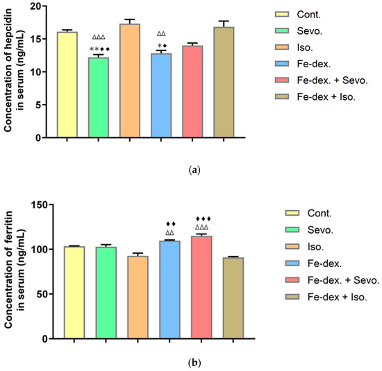 Concentration of hepcidin (a) and ferritin (b) in the serum of rats exposed to chronic administration of inhalation anesthetics and iron dextran and their combination. Rats (n = 10 per group) were treated with ip injection of iron dextran (50 mg/kg), exposed to 2.4 vol % Sevoflurane inhalation and 1.3 vol % Isoflurane inhalation, and exposed to a combination thereof where inhaled anesthetics were given 2 h after ip injection of iron dextran. Animals were treated every other day for 28 days. The results are expressed as the mean value of each experimental group ± SE. * Statistically significant compared to the control group (* p < 0.05; ** p < 0.01); ∆ statistically significant compared to the Isoflurane group (∆∆ p < 0.01; ∆∆∆ p < 0.001); ♦ statistically significant compared to the Fe-dex. + Iso.-treated group (♦ p < 0.05; ♦♦ p < 0.01; ♦♦♦ p < 0.001). Abbreviations: ip, intraperitoneal; SE, standard error; Cont., control group; Sevo., Sevoflurane group; Iso., Isoflurane group; Fe-dex., iron dextran group; Fe-dex. + Sevo., group treated with iron dextran and Sevoflurane; Fe-dex. + Iso., group treated with iron dextran and Isoflurane.