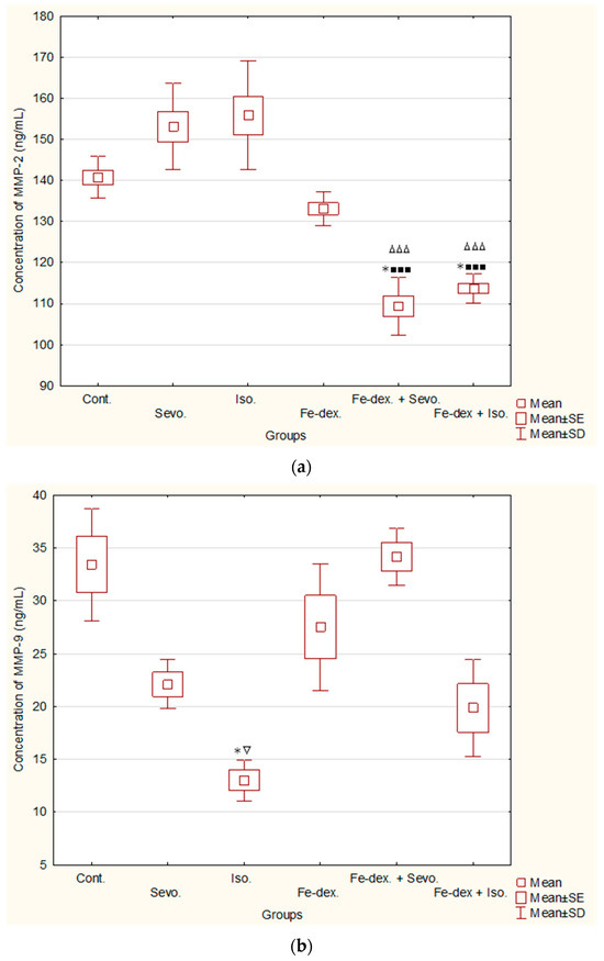 The concentration of MMP-9 (Figure 4b) was statistically significantly decreased in the group exposed to Isoflurane (13.02 ± 0.97) compared to the group treated with Fe-dextran + Sevoflurane (34.15 ± 1.34; p < 0.05) and the control group (33.42 ± 2.66; p < 0.05).