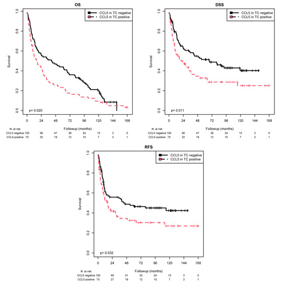 K–M analysis: association between CCL5 expression in TCs and prognosis. Positive CCL5 staining in TCs was associated with a shorter mean OS (p = 0.020), mean DSS (p = 0.011), and mean RFS (p = 0.032) than negative CCL5 staining.