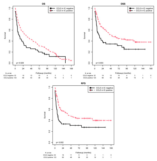 K–M analysis: association between CCL5 expression in ICs and prognosis. Positive CCL5 staining in ICs was associated with a longer mean OS (p = 0.029), mean DSS (p = 0.003), and mean RFS (p = 0.002) than negative CCL5 staining.