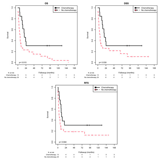 K–M analysis revealed a significant association between chemotherapy response and CCL5-negative ICs for the tumor stage subgroup pT3 + 4 in terms of the mean OS (p = 0.015), mean DSS (p = 0.039), and mean RFS (p = 0.044) (Table 6 and Figure 4). In other words, patients with pT3 + 4 and CCL5-negative ICs had a better prognosis after chemotherapy treatment than patients without such treatment, as reflected by a prolonged OS (50.7 vs. 22.4 months), DSS (50.7 vs. 29.6 months) and RFS (46.4 vs. 27.3 months). In addition, patients in the subgroup of N1/N2 had better OS after chemotherapy (mean 46.6 months) than did those who did not receive chemotherapy (mean 18.9 months; p = 0.024).