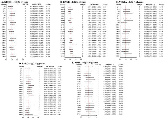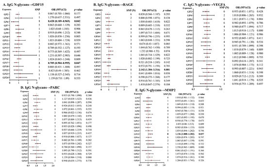 Genetic liability to GP6 was significantly associated with GDF15 according to the Wald ratio method (OR = 0.428, 95% CI = 0.189–0.969; p = 0.042; Figure 1 and Table S5). We observed that genetically determined GP17 was associated with GDF15 using two independent SNPs (fixed-effects IVW model OR = 0.709, 95% CI = 0.504–0.995, p = 0.047; Figure 1 and Table S5). In sensitivity analyses, the causal associations identified using the MR-RAPS method were marginally significant (OR = 0.707, 95% CI = 0.495–1.008, p = 0.056; Table S5). The MR analysis using the Wald ratio method revealed that GP19 was significantly associated with RAGE (OR = 2.142, 95% CI = 1.384–3.316, p = 0.001; Figure 1 and Table S7). Genetically predicted that GP15 was significantly associated with high levels of MMP2 using IVW methods (IVW fixed-model OR = 1.136, 95% CI = 1.008–1.282; p = 0.037; Figure 1), while it was inconsistent with the sensitivity analyses (Table S13). The IVW method provided no evidence for putative causal associations of IgG N-glycans on VEGFA and PARC (Figure 1), and the results of sensitivity analyses generated similar associations (Tables S9 and S11).