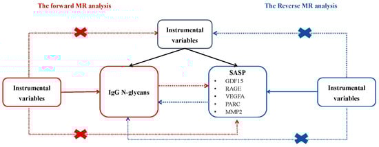 We set out to identify IVs of IgG N-glycans and SASP to include and employ the framework of MR and to explore bidirectional causal associations (Figure 3). For causal associations from MR studies, there are three assumptions that must be met: (1) selected IVs, namely genetic variants, are strongly associated with exposures; (2) the selected genetic variants are not supposed to be associated with any known or unknown confounders; and (3) those selected genetic variants must influence the outcome only through the exposure and not through any causal pathway. In addition, we reported an MR study according to the Strengthening the Reporting of Observational Studies in Epidemiology Using Mendelian Randomization (STROBE-MR) guidelines [35], and have provided a checklist of its items in Table S1.