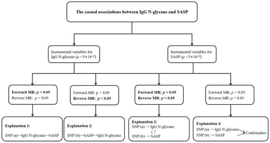 Figure 4 showed four potential explanations of the causal relationships expected in forward and reverse MR analyses. Explanation 1: the significant associations of genetically predicted IgG N-glycans on SASP. Explanation 2: the reverse causal associations between IgG N-glycans and SASP. Explanation 3: the bidirectional causality between IgG N-glycans and SASP (all p < 0.05). Explanation 4: no causal association in MR analyses (all p > 0.05). The MR analyses were based on using the “TwoSampleMR” package and R software (version 4.1.2).
