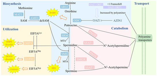 The cellular polyamine homeostasis is maintained by the biosynthesis, catabolism, and transport of polyamines. The hypusination of EIF5A is the best-known utilization of polyamines in cells. The abbreviations in the figure are the following: MAT1 (S-adenosylmethionine synthase 1); AMD1 (S-adenosylmethionine decarboxylase 1); ARG1 (arginase 1); ODC (ornithine decarboxylase); OAZ1 (ODC antizyme 1); AZIN1 (antizyme inhibitor 1); SRM (spermidine synthase); SMS (spermine synthase); MTA (5′-methylthioadenosine); EIF5A (eukaryotic translation initiation factor 5A); DHPS (deoxyhypusine synthase); DOHH (deoxyhypusine hydroxylase); SMOX (spermine oxidase); SSAT1 (spermidine/spermine N1-acetyltransferase); PAOX (polyamine oxidase); BABS (Bachmann–Bupp syndrome); SRS (Snyder–Robinson syndrome); DHPS disorder (deoxyhypusine synthase disorder); DOHH disorder (deoxyhypusine hydroxylase disorder); FABAS (Faundes–Banka syndrome).