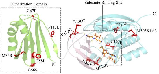 The structure of the SMS protein (PDB: 3C6K). Only a monomer is shown for clarity. The N-terminal, central, and C-terminal domains are colored yellow-green, pink, and light blue, respectively. The loop connecting the N-terminal and central domains is colored white. Spermidine (Spd) and 5′-methylthioadenosine (MTA) bound to SMS are presented as sticks. The mutation sites in SRS patients are shown as red sticks. The asterisk (*) indicates a translation termination codon.