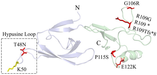 EIF5A is a small protein consisting of two β-sheet domains (Figure 5). The alkaline N-terminal domain contains the hypusination site [53,54]. The acidic C-terminal domain resembles an oligonucleotide-binding fold. The sequence homology between human EIF5A and yeast EIF5A is as high as 64% [55], and human EIF5A can be a substitute for yeast EIF5A in protein function [56]. In the yeast model, deleting either the N-terminal domain or the C-terminal domain of human EIF5A was lethal [54]. In FABAS, mutations in EIF5A lead to reduced interaction of EIF5A with the ribosome and decreased synthesis of polyproline-containing proteins [23]. p.T48N is close to the K50 hypusination site and hinders EIF5A hypusination. The arginine residue R109 has various mutations, including the missense mutation p.R109G, the nonsense mutation p.R109*, and the frameshift mutation p.R109Tfs*8. This amino acid is encoded by the CGA codon, and the CG dinucleotide is a mutation hotspot in human diseases because it is prone to methylation and deamination. In the computer-simulated complex structure of yeast EIF5A and the 60S ribosome, G106 and R109 are close to the uL1 ribosomal protein, and E122 is close to the P-site tRNA [23].