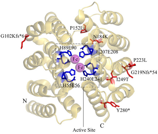 DOHH is a unique non-heme di-iron monooxygenase. The DOHH structure has a symmetrical dyad composed of eight HEAT-repeat domains in tandem (Figure 6). DOHH contains metal coordination sites (HE sites) consisting of four highly conserved histidine–glutamate motifs, namely H56-E57, H89-E90, H207-E208, and H240-E241. These HE sites are essential for enzyme activity and are involved in the binding of Fe2+ and substrates [57,58]. The DOHH disorder is caused by DOHH mutants with decreased enzyme activity. These mutants result in the accumulation of deoxyhypusine-containing EIF5A (EIF5ADhp), the decrease in EIF5AHyp, and impaired mRNA translation [24]. p.G102Kfs*6 loses the last two HE sites and has a very low expression level, possibly triggering nonsense-mediated mRNA decay. p.G219Nfs*54 loses the last HE site. These two mutants are inactive in in vitro activity assays. p.Y280* loses the C-terminal 22 amino acids and has low enzyme activity. In vitro experiments showed that p.P152L, p.N184K, and p.I249T had enzyme activities similar to the activity of the wild-type DOHH, but the enzyme activities of these mutants in patients were significantly lower compared to the wild-type protein in healthy individuals. This discrepancy will need further investigation.