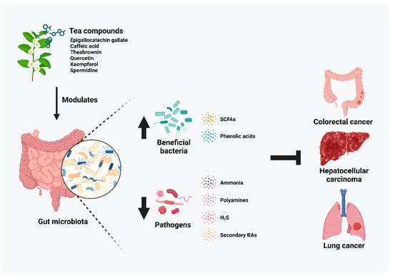 Summary of mechanisms involved in the modulation of gut microbiota by tea compounds in cancer management.