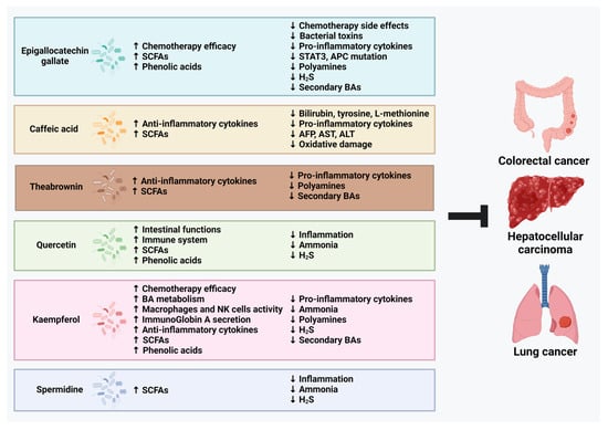 Apart from its direct impact on gut microbiome structure, gut microbiota also impacts the host’s health by producing microbiota-derived metabolites [,]. Among previously mentioned tea-altered gut microbes, they have previously been found to correlate with cancer-related metabolites including ammonia, polyamines, H2S, and secondary BAs. Furthermore, the administration of tea compounds was also shown to promote beneficial gut microbe-derived metabolites, SCFAs, and phenolic acids and downregulate the microbiota correlates to cancerous metabolite production (Figure 2).