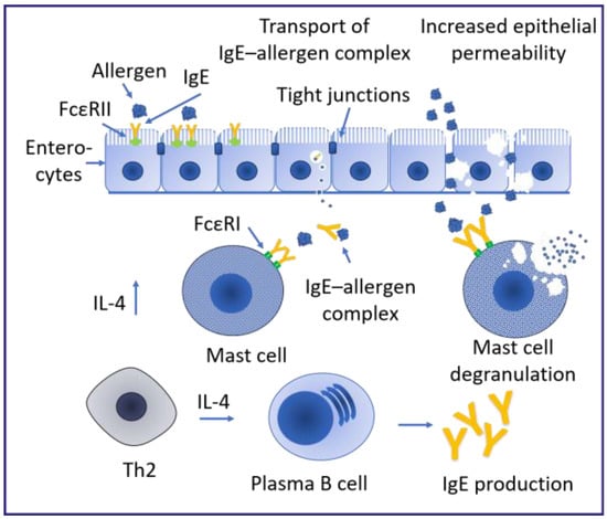 Role of CD23 (FcεRII) on enterocytes in regulating the inflammatory response in food allergy adapted from Ristivojević et al. []. IL-4 secreted by T cells increases the expression of the low-affinity IgE receptor (FcεRII, CD23) on the surface of enterocytes and induces the production of IgE in plasma B cells. Upon cross-linking of FcεRII on the surface of enterocytes, IgE and IgE–allergen complexes are taken up by the enterocytes and transported across the epithelial barrier without degradation. The IgE and allergen are exposed to the underlying immune system. The allergen can then bind to the high-affinity IgE receptor (FcεRI) on mast cells and induce degranulation. The degranulation of mast cells increases the membrane permeability and facilitates further allergen uptake. FcεRI—low-affinity IgE receptor (CD23), FcεRII—high-affinity IgE receptor, IgE—immunoglobulin E, IL-4—interleukin 4, Th2—type 2 T helper cell.