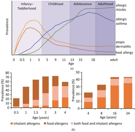 Sensitizations often occur in order of encounter with the allergens, which are accompanied by elevated IgE levels []. Early-life food sensitizers include hen’s eggs, cow’s milk, fish and peanuts [,,]. Food sensitizations in toddlerhood were identified as risk factors for skin and respiratory symptoms in childhood [,], while skin symptoms in toddlerhood were risk factors for respiratory symptoms in adolescence and adulthood []. Sensitizations towards hen’s egg and milk decreased from toddlerhood to childhood, yet peanut sensitization appeared to remain until adulthood [,]. In late toddlerhood and childhood, sensitizations towards inhalant allergens start to develop, and the most frequent sensitizers include house dust mites (HDMs), animal dander and pollen [,] (Figure 3b). Sensitization to inhalant allergens was found to increase as the children aged, reaching a 42.2% prevalence in young adults, while food allergen sensitization decreased to 8.2% [] (Figure 3b). These sensitizations become risk factors for the development of asthma in adolescence []. Early-life sensitization to certain risk molecules, e.g., Der p 23 from HDM, Fel d 1 from cat dander or Phl p 1 and Phl p 4 from timothy grass pollen, were predictive of respiratory allergy in adolescence and adulthood [,,,]. Allergic multimorbidity was associated with both food and inhalant allergen sensitization at different time points in life, with increasing sensitizations being risk factors for more persistent and severe symptoms [,]. Conversely, a lower level of sIgE and fewer additional inhalant allergen sensitizations in adolescence were indicative of the remission of allergic rhinitis between 16 and 24 years [].