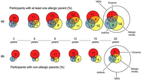 Prevalence of allergic multimorbidity over 20 years in patients with and without family history of allergic disorders after Gough et al. [] (license no. 5778240499608): (a) prevalence of allergic diseases over time in patients with parental history of allergy; (b) prevalence of allergic diseases over time in patients without parental history of allergy. The colors represent the different allergic morbidities: allergic rhinitis (yellow), asthma (blue) and eczema (red), whereas their overlap indicates the occurrence of multimorbidity. The numbers represent the percentages for each morbidity for each age group.