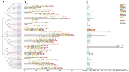 Analysis of the motif and gene structure of the GRAS gene family in C. goeringii. (A) Phylogenetic tree of 54 CgGRASs. (B) Determination of conserved motifs in the CgGRAS proteins. (C) Gene structure of CgGRASs.
