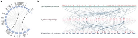 The collinearity analysis in C. goeringii, D. chrysotoxum, and D. catenatum. (A) Synteny analysis of C. goeringii. Black lines represent segmental duplicated gene pairs. (B) Collinearity analysis of GRAS genes of D. chrysotoxum, C. goeringii, and D. catenatum. The location of the SPLs is marked by a red triangle and the blue lines show GRAS genes with collinear relationships between different species.