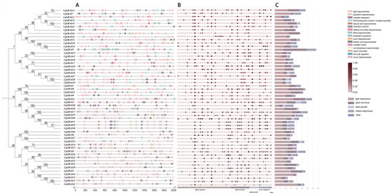 Promoter analysis of the CgGRAS genes. (A) The distribution of cis-acting elements at 2000 bp upstream of the GRASs. (B) The number of cis-acting elements in the promoter region. (C) The number of light response, plant hormone, plant growth, and stress response elements for each GRAS gene. The captions are marked on the right, and the types and quantities of cis-acting elements are shown in Table S5.