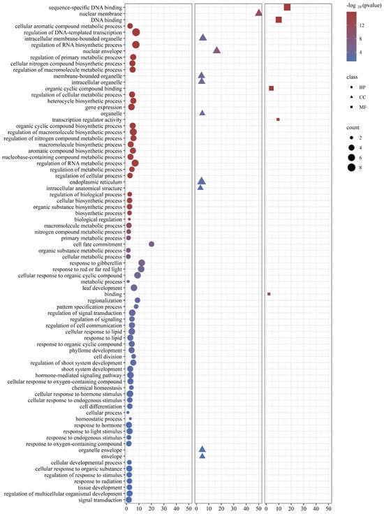 To unravel the functional intricacies of GRAS proteins across diverse biological phenomena within C. goeringii, a meticulous Gene Ontology (GO) annotation analysis was conducted on the CgGRAS gene (Figure 7). The findings indicated that GRAS proteins could potentially participate in numerous biological processes, cellular constituents, and molecular functionalities. The identified associations were found to exhibit diverse functionalities, encompassing metabolic process regulation, biosynthesis, response to abiotic stimuli, and hormones.