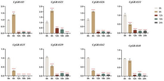 To examine the expression patterns of the CgGRAS gene under heat stress, we conducted RT-qPCR analyses on eight genes selected from various subfamilies. In the present study, qRT-PCR experiments were performed to analyze the expression patterns of the 8 CgGRAS members in leaves in response to heat treatment (Figure 8). Of particular note is the rapid increase in expression levels observed for three CgGRAS genes (CgGRAS5, CgGRAS21, and CgGRAS26) at 6 h post heat stress, with CgGRAS21 showing particularly notable upregulation. Whereas the expression of all eight genes was significantly reduced during the 12, 18, and 24 h after the heat stress. Following 12 h of treatment, the expression levels of five genes (CgGRAS31, CgGRAS35, CgGRAS39, CgGRAS42, and CgGRAS48) were diminished in comparison to those observed after 6 h of treatment. However, subsequent to 18 h of treatment, a slight increase in the expression of these genes was observed except for CgGRAS31. The lowest expression levels of DELLA subfamily members CgGRAS35 and CgGRAS42, along with the PAT1 subfamily member CgGRAS39, were observed at 12 h. In contrast, CgGRAS48 from the PAT1 subfamily exhibited its minimum expression level after 24 h of-high temperature treatment. The expression of CgGRAS31 (HAM subfamily) remained largely unchanged after 12 h but declined to its minimum at 18 h.