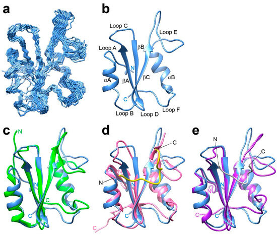 NMR solution structure of Drk-SH2 determined in the presence of the Sev-derived pY-containing peptide. (a) A superposition of the final 20 structures with the lowest CYANA target function values showing the backbone (N, Cα, C′) atoms. (b) The lowest energy structure in the structure ensemble shown in (a). The positions of loop regions, α-helices and β-strands are indicated on the ribbon model. Comparisons of the Drk-SH2 structure (light blue) and the representative solution structure of GRB2-SH2 on its own (green, PDB ID: 6VK2) [23] (c), the solution structure of GRB2-SH2 in the complex with a Shc-derived peptide (DDP-SpYVNVQNLDK) (pink, PDB ID: 1QG1) [19] (d), and the crystal structure of GRB2-SH2 in the complex with a pY-containing peptide (KPFpYVNVEF) (magenta, PDB ID: 1BMB) [24] (e). In (d) and (e), the N- and C-termini of the pY peptides (shown in yellow (d) and in white (e)) are indicated.