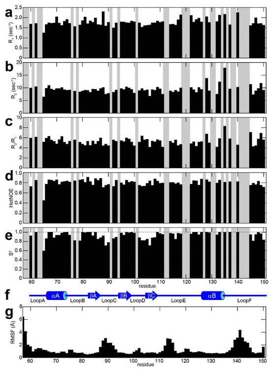 Plots of the backbone 15N R1 (a), R2 (b), R2/R1 (c), {1H}-15N NOE (d), and S2 values calculated by model-free analysis (e) for Drk-SH2 in the presence of the Sev-derived peptide, KQLpYANEGVSR, against the amino acid sequence. Grey bars correspond to proline residues and to residues for which 1H-15N correlation cross peaks were not analysed due to signal overlap. The secondary structure of Drk-SH2 is also shown (f). (g) The root-mean-square fluctuation (RMSF) plots against the amino acid sequence from the 2 µs molecular dynamic simulation of Drk-SH2.