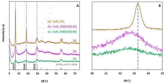 XRD patterns of the CoAl LDH materials prepared with and without CMβCD at (A) [5–80] 2θ range and (B) [20–25] 2θ range. The diffraction peaks of the JCPDS card number 37-0630 are included for comparison purposes.
