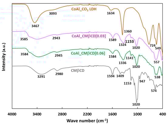FTIR spectra of CoAl_CO3 and CoAl_CMβCD[X] with X = 0.03 and 0.06. For comparison, the FTIR spectrum of CMβCD was also included.