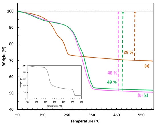 TGA profiles of (a) the LDH-based materials (CoAl_CO3; (b) CoAl_CMβCD [0.03]; (c) CoAl_CMβCD [0.06]) obtained under air flow. CMβCD profile has been given in the box.