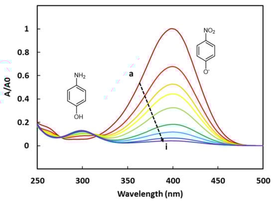 The 4-NPhOH reduction towards 4-aminophenol (4-APhOH) in an aqueous sodium borohydride solution (pH = 9.2) in the presence of the cobalt-based LDH, was monitored by UV-vis spectrophotometry. Before introducing the cobalt-based LDH, a color change (from pale to bright yellow) was observed, corresponding to the deprotonation of 4-NPhOH giving 4-nitrophenolate (4-NPhO−). This color change was not surprising, taking into account the pH value of the solution (9.2) and the pKa value of the (4-NPhOH/4-NPhO−) couple (7.2). The progress of the reaction was basically monitored by the disappearance of the 4-NPhO− band at 400 nm (ε4-NPhO− = 2.16 × 104 L.cm−1.mol−1). The expected product (4-APhOH) band was centered at 300 nm (ε4-APhOH = 4.15 × 103 L.cm−1.mol−1) (Figure 4). It should be noticed that the absorbance values of the amino product are much lower than those of the nitro compound. This tendency has been clearly confirmed by preparing a synthetic equimolar mixture of 4-NPhOH and 4-APhOH in a sodium borohydride solution for allowing the total deprotonation of 4-NPhOH. The resulting solution was analyzed by UV-Vis spectroscopy, showing a much thinner absorbance for the 4-aminophenol compound (ESI—Figure S3).