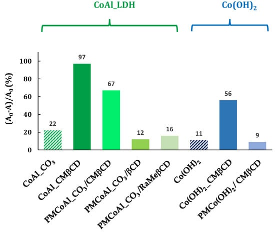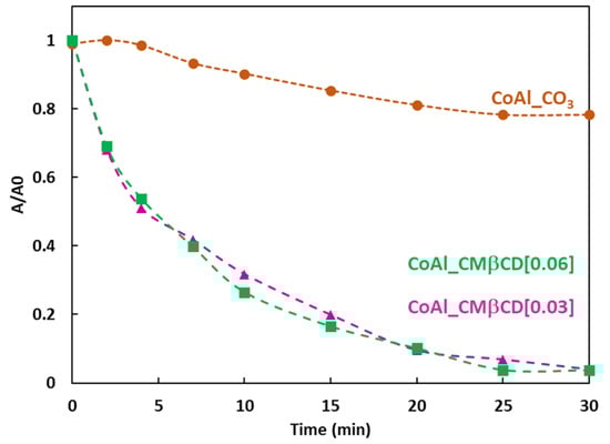 The performances of the CoAl_CMβCD[X] materials (X = 0.03 and 0.06 M) in the reduction of 4-NPhOH in a NaBH4 medium as a function of time are given in Figure 5. For comparison, the results obtained with the CMβCD free CoAl LDH control sample are given.