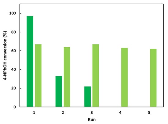 Recycling attempts for the 4-NPhOH reduction in NaBH4 aqueous solution in the presence of CoAl_CMβCD [0.06] or CoAl_CO3 with additional free CMβCD in the reaction medium. After a 30 min test, the suspension was centrifuged, and the recovered solid was washed and allowed to react for an additional test. Reaction conditions: dark green bars: 4-NPhOH (2 µmol), NaBH4 (0.2 mmol), H2O (30 mL), CoAl_CMβCD [0.06] (initial weight = 20 mg); light green bars: 4-NPhOH (2 µmol), NaBH4 (0.2 mmol), H2O (30 mL), CoAl_CO3 (initial weight = 15 mg), CMβCD (5 mg).