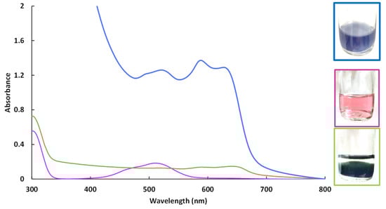 UV-Visible spectra of aqueous cobalt(II) solutions at pH = 10.5. Cobalt(II) nitrate solution at pH 6 (purple curve), cobalt(II) nitrate solution at pH 10.5 (green curve) and cobalt(II) nitrate solution at pH 10.5 with CMβCD (blue curve).