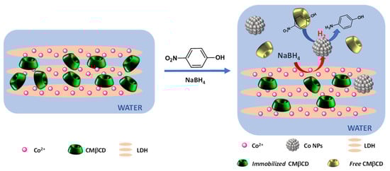 In this present study, cobalt-aluminum-based LDH-containing carboxymethyl β-CD (CMβCD) were synthesized by a one-pot co-precipitation approach, characterized through different physicochemical techniques (XRD, TGA, FTIR, SEM-EDS) and tested as a cobalt source for the degradation of 4-NPhOH, in the presence of sodium borohydride. Several series of controls were carried out to emphasize the beneficial effect of the hybrid nature of the cobalt-based materials, but also the LDH structure on the reduction reaction efficiency. Complementary experiments were also performed to have a deeper understanding of the role played by the different partners during the 4-NPhOH reduction in an aqueous medium. Recycling experiments were finally investigated to evaluate the recovery of the hybrid materials.