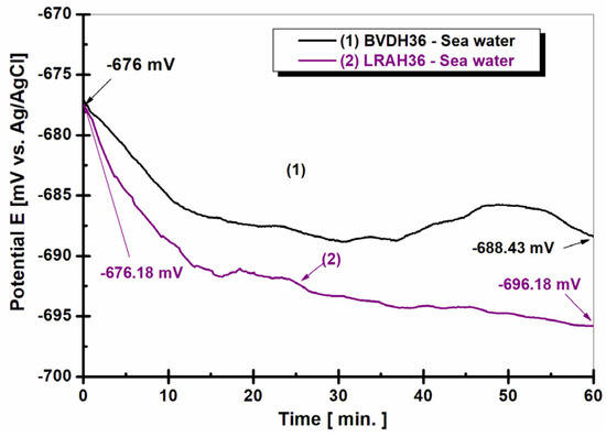 Figure 5 shows the evolution of the free potential of BVDH36 and LRAH36 steels immersed in natural seawater for a period of 26 h.