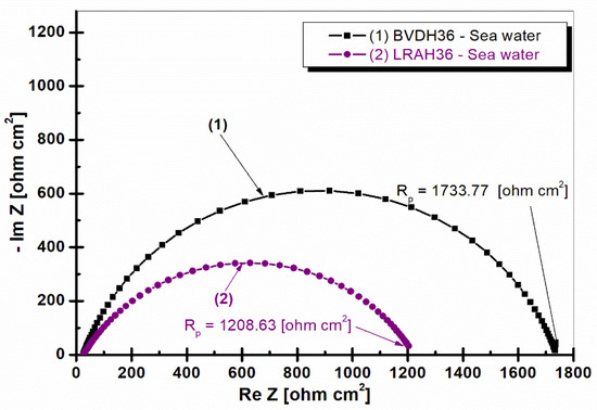 From the analysis of Figure 10, it can be seen that the average value of the polarization resistance in the case of BVDH36 steel is approximately two times higher than the value obtained by LRAH36 steel. At the same time, it is well known in the specialized literature that the polarization resistance is inversely proportional to the corrosion rate; in other words, the higher the polarization resistance for a studied material, the lower the corrosion rate.